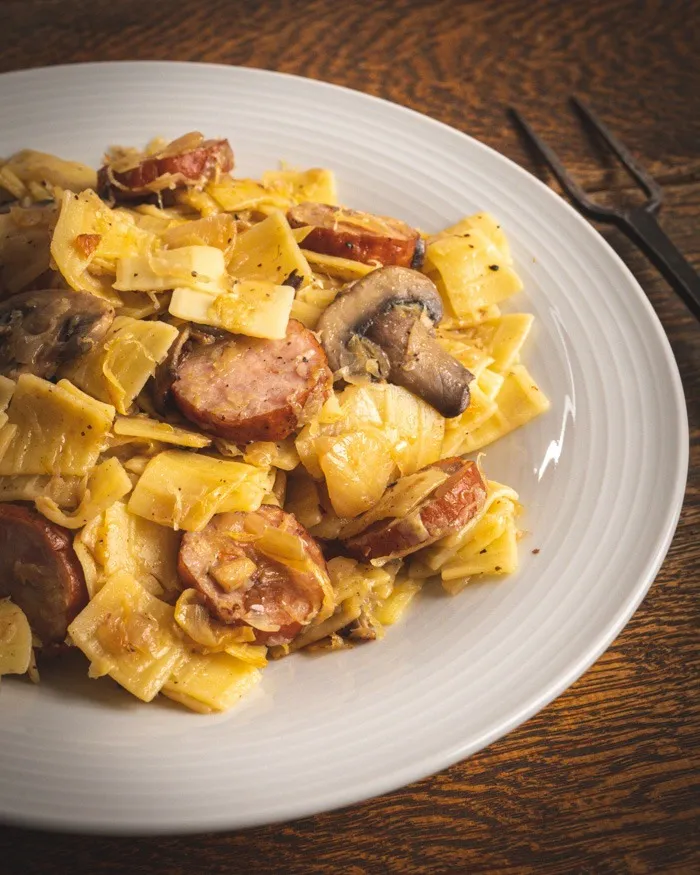 This dish is a celebration of contrasts: the acidity of fermented cabbage balanced by the richness of kielbasa, the bite of caraway seeds dancing alongside soft, chewy pasta. It’s simple enough for a casual weeknight meal, yet substantial enough to serve for holidays or special family occasions.